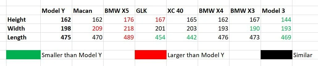 Size Comparison between Similar Sized SUV/Cross in “cm.” Width includes mirrors.