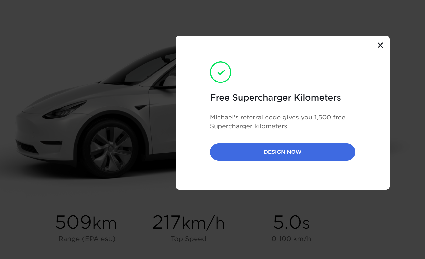 Make sure to check at the order page that the referral code has been applied at the order page. You should see Free Supercharge Kilometers.