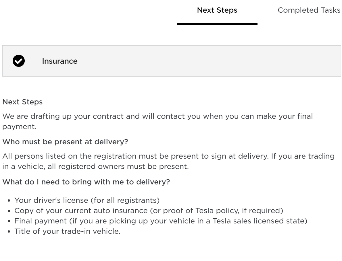 Proof of current insurance is required. You will need to take a picture of it and upload it to Tesla. After submission, Tesla will draft the final documents to prepare for your delivery.