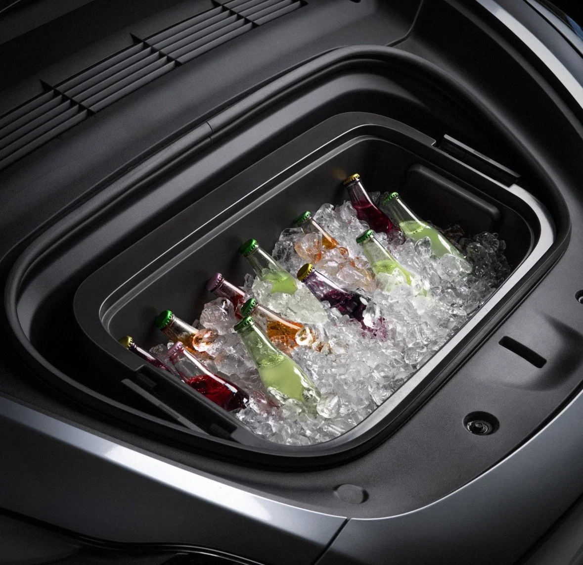 - Trunk Features: Hands-free power operation and a drain plug in the front trunk for easier cleaning[1][5]. The front seats actually move forward so the rear seats fold down smoothly without hitting the front seats. And, you can now have a drink bar in your frunk.
